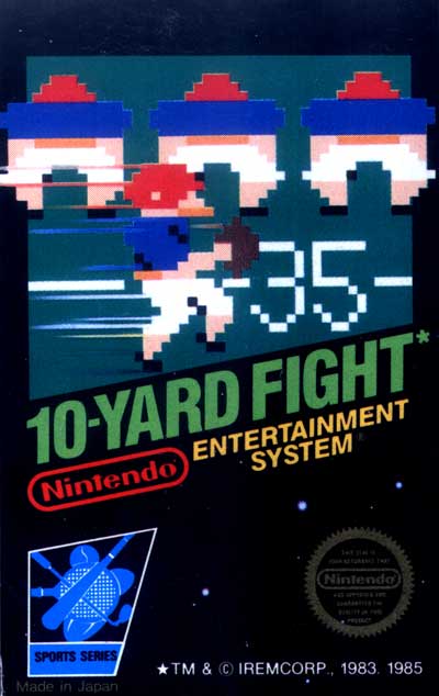 American Football, the intense game where muscle, brains, and passion collide... brought to lifelike realistic action, for the first time on your Nintendo Entertainment System. Well... sort of. Whether playing alone, or watching, you can't help but become overwhelmed with an urge to assemble into a donut formation and take to the gridiron. Defense is ready to stop you with as many as 183 starting formations and as many as 133,407 plays. Don't get caught with your shoulder pads on backwards! The game gradually gets harder as you progress. You start playing high school, then college, then pro, then play-off, and finally Super Bowl level. Come up with game-winning strategies and nice moves for both offense and defense. Part of the original sports lineup in Nintendo's "black box" series.