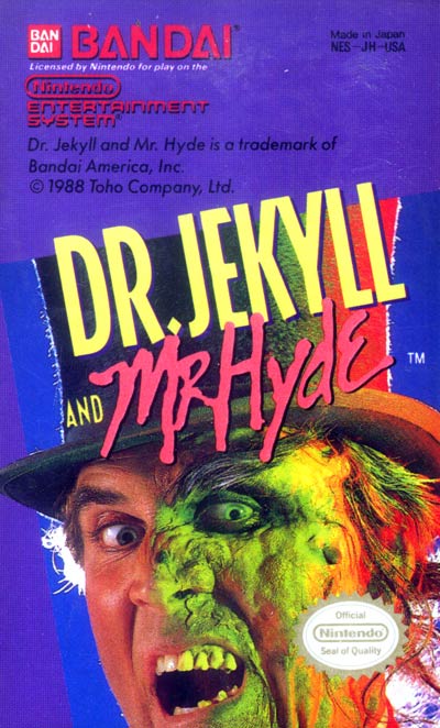 Dr. Jekyll and Mr. Hyde is a 1989 game for the Nintendo Entertainment System released by Bandai that is split between a light and dark world. In the real world, Dr. Jekyll moves right through Victorian England, as he walks to a nearby church for his wedding. However, once his anger 'meter' is filled, he turns into Mr. Hyde, who walks left through a parallel world of demons and can only change back by fighting monsters and emptying the stress meter. The object of the game is to make it to the church without dying, and without Hyde and Jekyll's paths crossing (Jekyll dies instantly if Hyde catches up with him). Mr. Hyde has a weapon called the Psycho Wave with which to fight off monsters, but Dr. Jekyll is virtually defenseless save for his cane, which can destroy an enemy insect. Dr. Jekyll faces attacks from bombers, archers, children, and even singers, while Mr. Hyde faces hopping brains, zombie babies and evil mermaids. The game is thought of by many fans as extremely difficult to beat without using a Game Genie. It's considered to be one of the worst games ever released for the system due to the fact if Hyde travels further than Jekyll he will be struck by lightning, seemingly at when he is in the cross paths with Dr.Jekyll (go at the same place he transforms) and die. It has gained a cult notoriety due to its reputation.