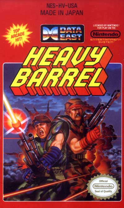 The story is that terrorists have seized the underground control complex of a nuclear missile site, and it is up to the player to infiltrate the base and kill the enemy leader. The name "Heavy Barrel" comes from a powerful weapon within the game that the player collects pieces of throughout the game. If all of the pieces are collected, the player can wield it for about 30 seconds. The players started out with some sort of laser gun that had unlimited ammunition (which occasionally proved necessary) and a limited supply of grenades. Players might find better weapons, grenade powerups, or keys to unlock boxes which themselves might have better weapons, grenade powerups, orbs (if you had 2 players), or one of the 6 pieces of the Heavy Barrel superweapon.