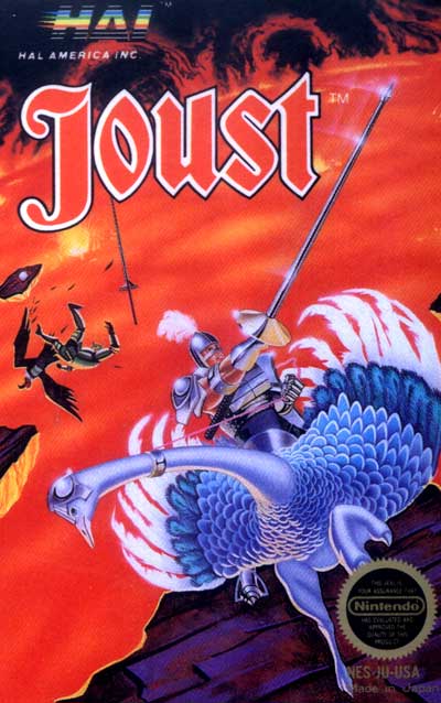 The player takes the role of a knight with a lance, mounted on an ostrich, battling waves of computer-controlled enemy knights. The enemy knights have three different speed and agility levels and are mounted on large, vulture-like creatures of their own. Second players were mounted on white, stork-like birds. The game screen is static; its only features are five platforms hanging in mid-air (some wrapping around the screen), the ground, and a pit of lava below. The game's incredibly simple controls are a factor in its wide appeal. A joystick moves left and right, and a "Flap" button flaps the mount's wings once. Pressing "Flap" in rapid succession will cause a gain in altitude until gravity drags the player downward.