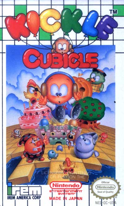 The gameplay of Kickle Cubicle is very similar to the Adventures of Lolo puzzle series. Kickle has ice-cold breath which can freeze some enemies into ice blocks. The resulting ice blocks can then be kicked across the screen to solve puzzles. Kickle can also create ice pillars which can be used as stoppers to further manipulate the direction of the ice blocks, or alternatively to trap enemies. There are four worlds (Garden Land, Fruit Land, Cake Land and Toy Land); each of which contains numerous boards, a boss, and a princess to be rescued. The object of the game is to avoid touching a variety of different enemies and hazards, meanwhile making ice cubes out of enemies and using functional objects (such as hammers and springs) in order to fill holes in the ice, create bridges and paths, and collect all of the red "dream bags" on each board.