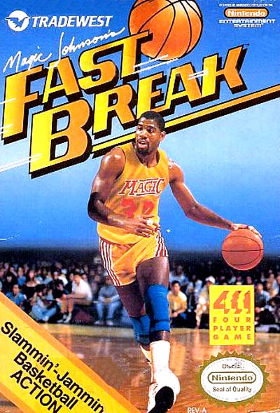 Magic Johnson's Fast Break is fast-paced two-on-two action rather than the usual five-on-five contest. On screen you get a full-court, horizontally-scrolling gameplay. A referee monitors the action and calls the fouls if the gameplay gets too rough, and a crowd cheers you on. Your team starts each game at a certain salary level. Your goal is to beat the opposition to earn a larger salary. Keep winning and you might etch your name onto the Big Earners Screen. Choose from five skill levels - Rookie to Professional. Each level provides quicker gameplay, tougher defense, and bigger bucks if you win. Each game lasts four three-minute, real-life quarters. In between quarters, you can review stats such as field goal percentage, three-pointers made, rebounds, and steals. If the score is tied at the final buzzer, you play additional quarters until someone wins. You control one player at a time. An arrow appears on-screen above the head of the player you're running. Just hit B to switch players. You can play against the computer or up to three friends.