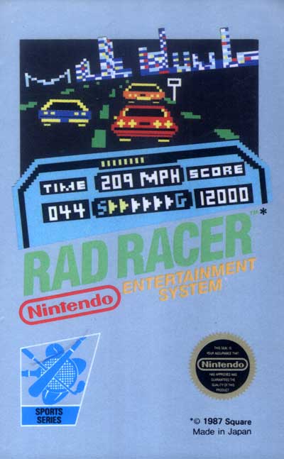 Rad Racer is an arcade style 3-D racing game. The object of the game is to race to the goal within the given time limit. Along each course are several checkpoints which will increase the amount of time you have to reach the final destination. There are eight different stages with increasingly difficult roads, changing weather conditions, and a variety of opponents who tend to get in the way. Included with the game is an optional pair of red-blue 3-D glasses which can be used to give the game an even more 3-D appearance.