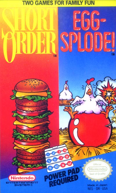 One of a handful of games designed exclusively for use with Nintendo's Power Pad (a floor mat with 12 large, touch-sensitive buttons), Short Order/Eggsplode for the NES features two games in one Game Pak. Short Order has you working in a hamburger shop, trying to please customers by building their burgers (which consist of meat, cheese, lettuce and tomato) in the same sequence in which they were ordered. When an animal comes into the shop, he will order a hamburger with three ingredients; then he will keep adding an ingredient with each successive turn. The bigger the animal, the more ingredients he will eventually want on his hamburger. For example: mice are satisfied with their order at 10 ingredients while pigs keep going until they have ordered 99 ingredients. In two-player mode, one player assumes the role of a fox while the other plays a dog. Contestants take turns ordering hamburger ingredients until one player gets the sequence wrong three times. In Eggsplode, a scheming fox has sneaked into the chicken coop and is looking to raise some ruckus with the hens by planting bombs under them. The hens' nests are laid out in the same sequence (4x3) as the spaces on the Power Pad. When a fox plants a bomb under a chicken, you must step on that bomb. When the game begins, there is one fox with 10 bombs, but as the game wears on and gets faster, it progresses up to three foxes with 60 bombs.