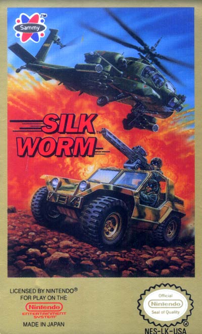 A port of an arcade game of the same name, the game puts you in control of a jeep that fires a cannon and missiles at assorted targets from a side scrolling perspective. In a similar vein to such war-themed vehicle based shooters as Tiger Heli, Silk Worm had interesting graphics and relatively fast-paced gameplay thanks to the nimble player controlled jeep that could travel freely on a two-dimensional level viewed from a top-down perspective. An interesting element of the game was the ability to rescue your comrades and carry them in the jeep with you. When your vehicle took a hit, the rescued hostages would be ejected from the vehicle and scatter, requiring you to drive around and gather them back up. The game employed some destructible environmental elements such as buildings and ancient ruins, and was quite interesting and challenging at the time.