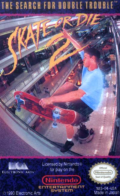 Skate or Die 2: The Search for Double Trouble is a side scrolling game, though the player can retrace his steps and return to areas he has seen before. The hero has a variety of skateboarding moves and weapons at his disposal, the controls for which can be programmed by the player. The hero's primary weapon is his paintball gun, though he can also throw eggs and firecrackers at his opponents. The game also has a bartering system. During the journey the hero can pick up CDs, cassette tapes, French fries, and tacos. These items can be traded with Rodney and Lester for new tricks and skateboards. There are also a total of five skateboards in the game. The one the player starts with is slow and does not jump very high, but by meeting up with Rodney the hero can acquire two progressively faster and higher-jumping skateboards, with each one replacing the hero's current board. Later in the game Rodney can sell the player two boards that do not replace his current board. One is fast but has poor jumping abilities, the other jumps high but is slow.