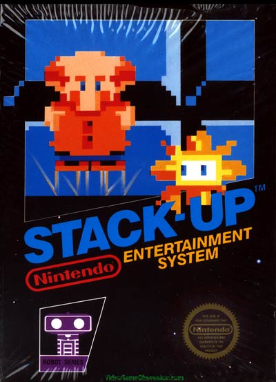 Designed for use with the Robotic Operating Buddy. Stack-Up is one of two games in Nintendo's Robot Series, the other being Gyromite. The player begins by arranging the blocks in a standard starting pattern (red, white, blue, yellow and green top-to-bottom on tray #3), and is given a randomly chosen pattern they should be rearranged into by entering commands for R.O.B. one at a time. Once the goal is achieved, the player must press start to inform the game. Score is then calculated based on the time and number of moves taken, and the game moves onto the next phase, for which the starting point is the previous phase's ending position. Phases grow increasingly complicated to execute as the player progresses. Play continues until a block is dropped. The score at that time is the final score, and the player must return to the menu screen by pressing select.