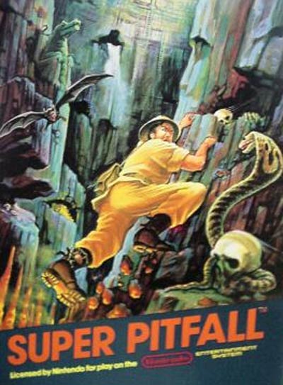 Super Pitfall is a 1987 Japanese game for the Famicom and NES developed by Micronics for Pony and Activision. It was the first game ever that Activision published for a system made by Nintendo and it was based upon Activision's earlier Pitfall series for the Atari 2600. This game was also ported to the Tandy Color Computer 3. Super Pitfall is somewhat loosely based on Pitfall II: Lost Caverns, in that the object is to move Harry through the mazes to find the Raj diamond, and rescue his niece Rhonda and sidekick Quickclaw, both of whom have become lost in the caverns. In Super Pitfall, however, Harry must also return to his starting point after accomplishing these objectives. Also, unlike Pitfall II Harry has only a limited number of lives to do all of this in (the original game gave Harry infinite lives, with the only penalty for "dying" being a reduced score). This time, Harry is also equipped with a gun with which he can shoot the various creatures that inhabit the caverns; he has limited ammunition, however, and must find additional bullets scattered throughout the game. Gathering gold bars results in extra points. Completion of the game requires the memorization (or mapping) of numerous hidden keys and warp zones; revealing each secret requires a precise jump, so the exploration portion of the game is made extremely tedious.